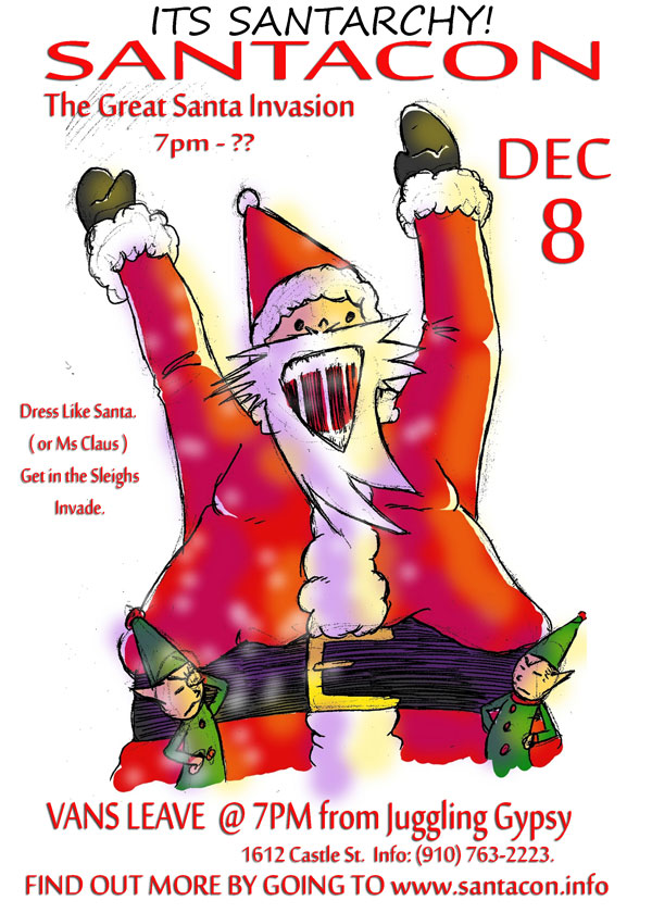 If you KNOW you are going, please EMAIL us now to RSVP. Reserve a space in the Vans early. Early passes are available at the Juggling Gypsy. Ask a staff member. The more early people we get, the better idea of how many people are going, so we can accommodate All Santas to ride in style! Van reservations are $10.00 for shuttling your Santa Self around all night!